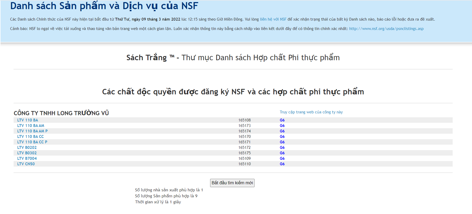 Quý khách hàng có thể truy cập vào hệ thống của tổ chức NSF để xem chi tiết: https://info.nsf.org/USDA/Listings.asp
