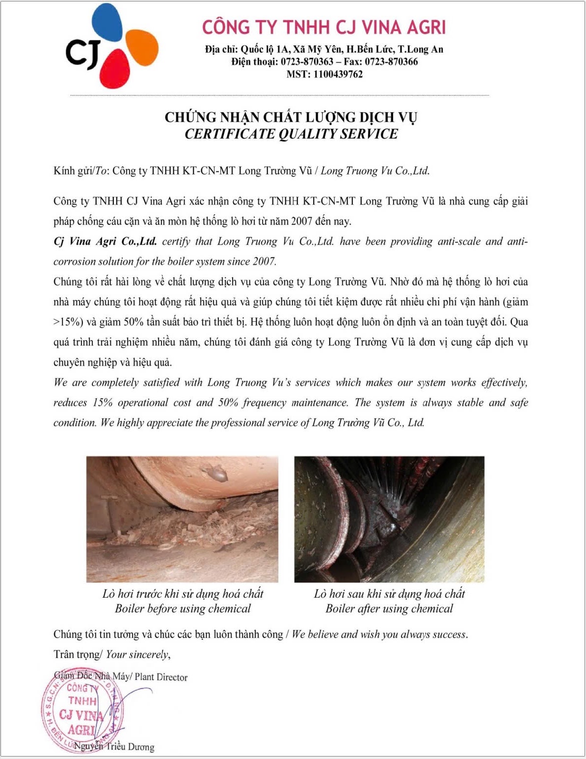 Qua nhiều năm hợp tác, CJ Vina Agri đánh giá Công ty Long Trường Vũ là đơn vị cung cấp dịch vụ chuyên nghiệp, hiệu quả và đáng tin cậy trong lĩnh vực xử lý cáu cặn, ăn mòn nồi hơi.