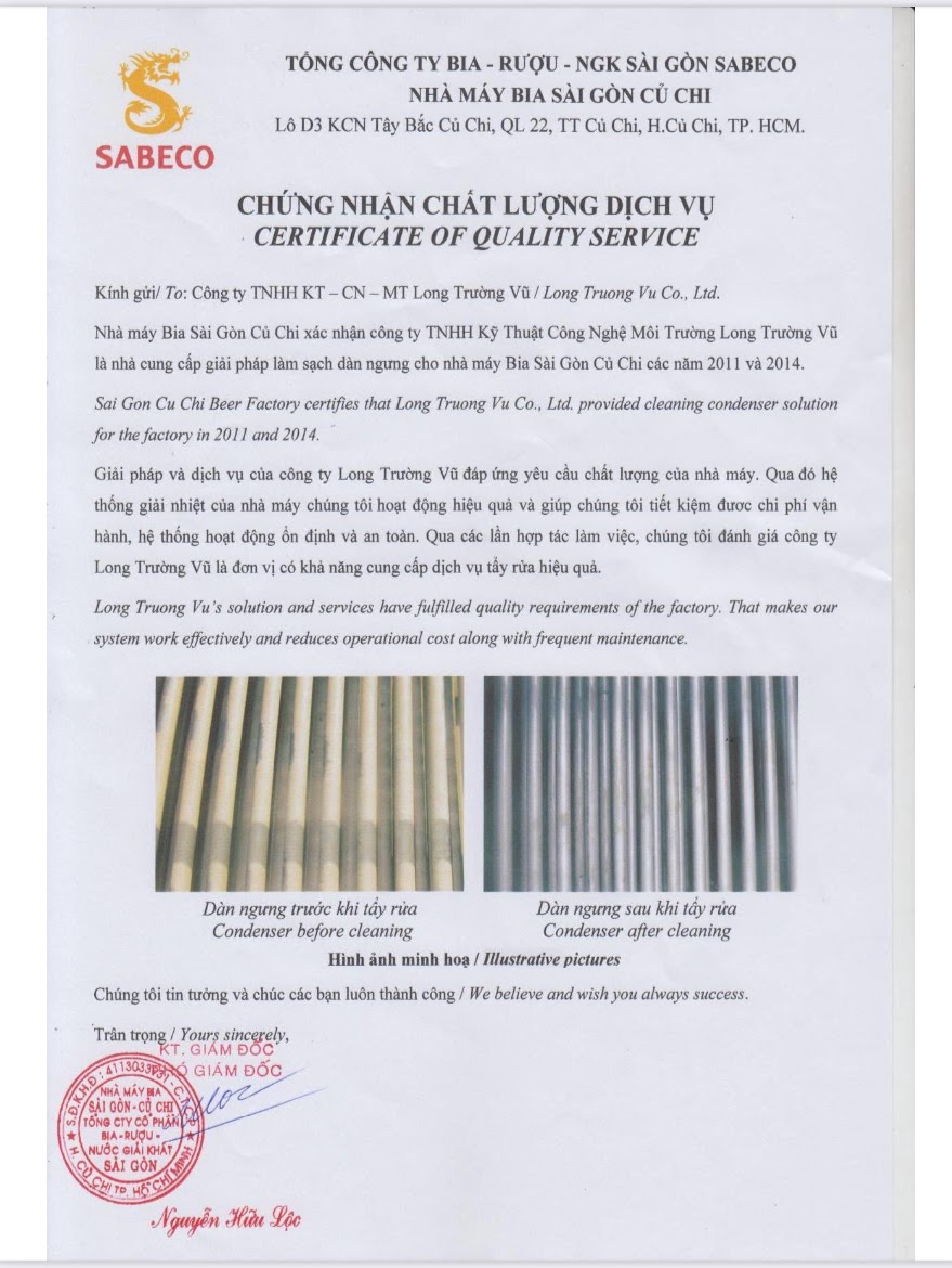 Theo Chứng nhận Chất lượng Dịch vụ được cấp bởi Nhà máy Bia Sài Gòn Củ Chi, Long Trường Vũ đã cung cấp giải pháp làm sạch dàn ngưng cho nhà máy trong các năm 2011 và 2014,... Kết quả mang lại sự hài lòng tuyệt đối cho đội ngũ kỹ thuật và ban lãnh đạo.